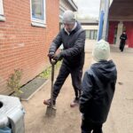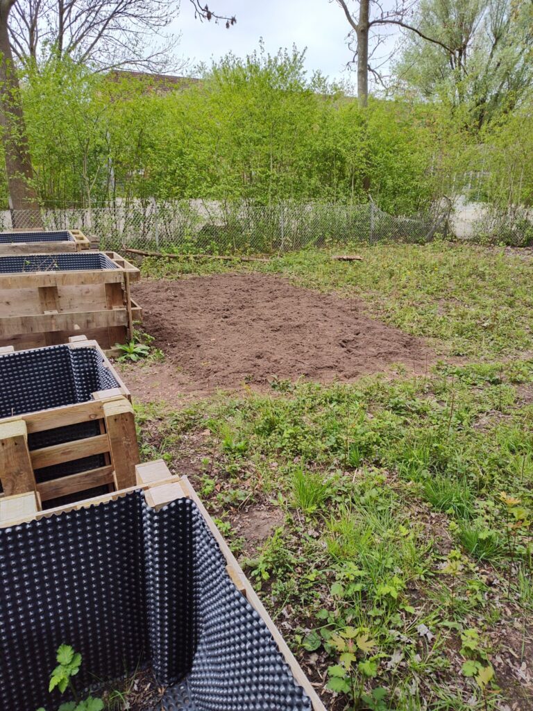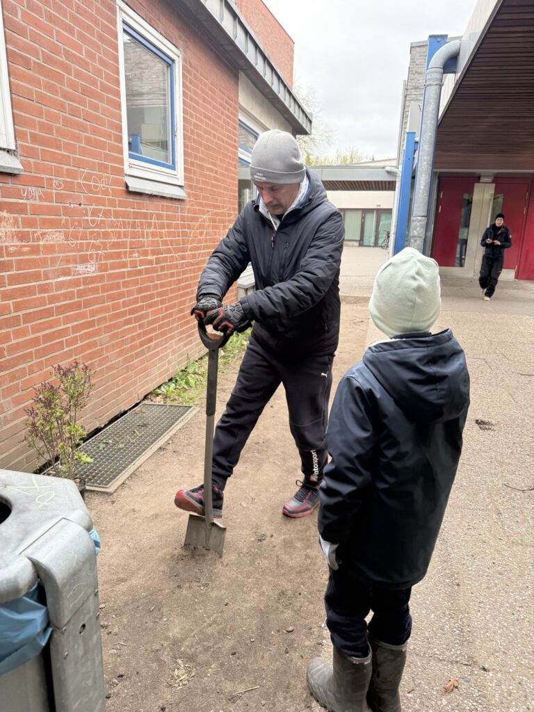 Zwei Väter gruben unermüdlich das hintere Feld um, damit dort hoffentlich bald ein neues Beet entstehen kann.