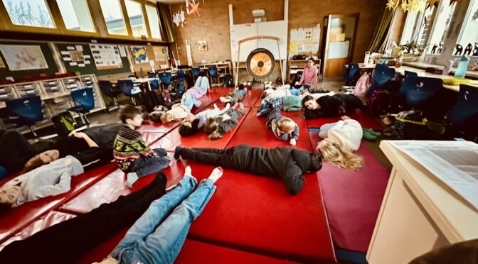 Die Kinder machten es sich auf den gemütlichen Matten in ihrem Klassenraum bequem, konnten sich ausstrecken und entspannen. Wir durften die Schwingungen der Herz- und Becken-Klangschalen auf dem eigenen Körper spüren. Das war genau das Richtige zur Einstimmung auf eine ruhigere Zeit.